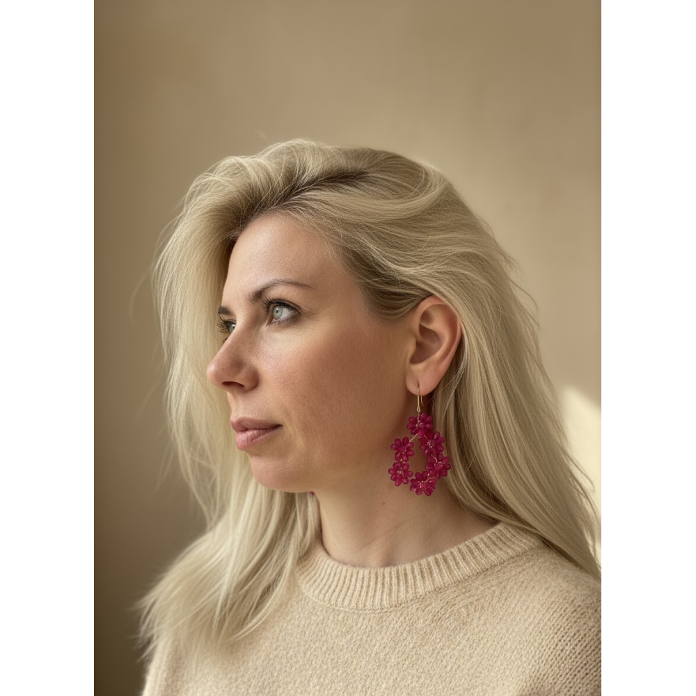 Combineer deze statement bloemen oorbellen met een effen blouse of jurkje voor een stijlvolle, vrolijke look. Laat je dag bloeien — in kleur!